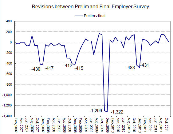 The media, of course, rarely go back and correct the record. Here is a chart of monthly revisions. Novembers are unrevised, last month has had its first revision, and September's numbers are final. Here is a graph showing the size and direction of the revisions over the last few years: